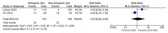The adverse effects of the ketogenic diet were only reported in three RCTs [14,23,25] but only two of the RCTs [14,23] were able to report the number of adverse events which occurred in the participants. When the reports were compared among these two RCTs, it was found to have no statistical significance between the two interventions. However, because the heterogeneity was very significant (I2 = 82%), this result may not necessarily be true. Since both RCTs had participants diagnosed with cancer, they have undergone treatment including chemotherapy and/or surgery. These therapies may have caused adverse effects during the consumption of KD or non-KD diets. There is no definite proof of whether these adverse effects observed during the interventions were specifically caused by the diets itself.