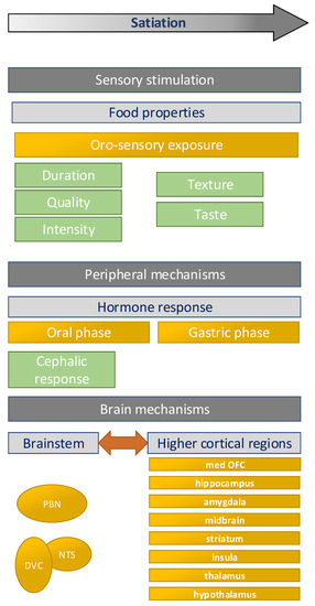 The precise physiological mechanisms by which oro-sensory exposure affects satiation has not been elucidated. It has been hypothesized that sensory signals travel from the oral cavity through afferent cranial nerves V VII, IX, X, and XII to the brainstem, and then higher cortical regions, as discussed in Section 3.2. In addition, oro-sensory exposure signals induce a cascade of efferent responses responsible for optimal food digestion, as discussed in Section 3.3 [51]. Ultimately, satiation evolves in the brain (among other regions in the reward center and orbitofrontal cortex) as a result of the integration of direct oro-sensory signals and indirect signals arising from the gastrointestinal tract. The following paragraphs discusses these hypothesized mechanisms in more detail.