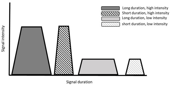 Schematic overview of our hypothesis underlying oro-sensory exposure. The area under the curve represents the level of oro-sensory exposure, which depend on both the intensity and the duration of the sensory signal.