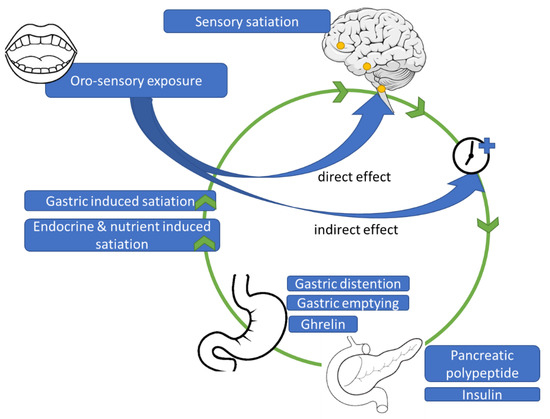 Eating is an episodic process, people consume meals or snacks followed by periods of fasting. People eat of a meal until they feel satiated, which translates into satiety, i.e., the period between two eating episodes. The processes of satiation and hunger involve feedback mechanisms that originate from different parts of the gastro-intestinal tract. Ingested and absorbed food components elicit a cascade of physiological and metabolic processes that affect satiety and, consequently, food intake [1,2]. Oral signals and perceived sensory properties of foods have been considered to play a role in the early, pre-absorptive phase of food ingestion. Post-absorptive factors, arising from the stomach and intestines, play a role in satiety and the initiation of the next meal. In this review, we focus on the physiological processes that are initiated as a result of the presence of food in the mouth, i.e., oro-sensory signals. This review addresses how oro-sensory signals relate to earlier satiation and lowering food intake, in the context of weight management and obesity prevention.