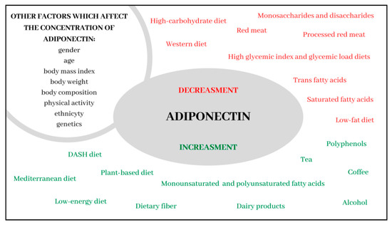 Due to the fact that available knowledge should be systematized, this study aimed to summarize the most recent research on the influence of dietary factors on the concentration of adiponectin.