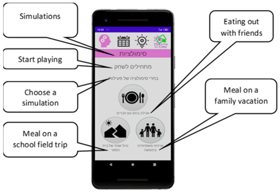The application, “Plan My C-Day,” was developed using Android Studio and Firebase as a cloud-based database by a group of undergraduate students, as part of their program capstone project. It is available (on Google Play) for smartphones with Android operating systems. It requires logging in with a username and password generated by the system administrator (the researchers). The main functionality of this first version of the application is the simulation of preparing oneself to participate in away-from-home food-related events. Three food-related events were chosen for this purpose based on the event included in the previously developed CD Chart questionnaire [34]: eating out with friends, a meal on a family vacation, and a meal during a school fieldtrip (Figure 1).