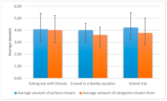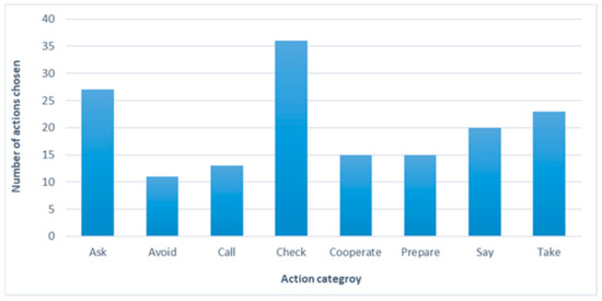The average overall time that users spent in the application was 16:23 min (SD = 6:49), with a mean time of 3:33 min on each simulation. For 76.92% of the users, the time to complete the simulation decreased from the first simulation to the last (third) by an average of 50%. Two (15%) users spent almost the same amount of time (difference < 20 s) in the first, second, and third simulation activities. Only one (7.5%) user showed a significant difference between time spent on the first (1:44 min) and third (3:18 min) simulations. Mauchly’s test indicated that the assumption of sphericity had been violated, χ2(2) = 15.29, p < 0.05; therefore, degrees of freedom were corrected using Greenhouse–Geisser estimates of sphericity (ɛ = 0.57). The results show a significant difference between the time spent on the three simulations, F (1.1, 13.71) = 4.64, p = 0.04, η2 = 0.279. Users selected an average of 4.1 actions for each simulation, from 3.8 categories (Figure 4). This resulted in a total of 160 actions selected in all three simulation plans, ranging from 13 to 36 actions from each of the eight categories chosen by each user (Figure 5).