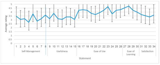 The average total score of the user perception items was 3.71, with scores ranging from 2.71 to 4.68 (Mdn 3.82) on the 34 items. The lowest ratings were assigned to questions dealing with the application’s contribution to the users’ self-management of their dietary limitation, whereas the highest rankings were assigned to system ease of use and ease of learning (Figure 6).