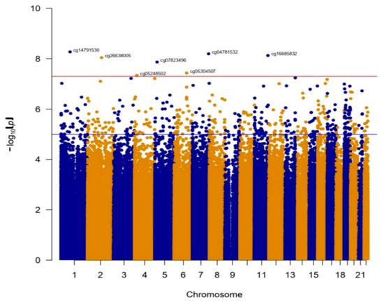 In the comparison of bulimia nervosa and binge-eating disorder, we found 11 differentially methylated sites at a genome-wide level (p-value < 5 × 10−8) (Figure 1).