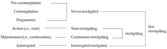 Stage of food stockpiling for disaster was assessed based on the transtheoretical model (TTM), which is a model derived from smoking cessation studies [26,27,28]. TTM is known to be useful for understanding the processes of change in diet-related behaviors [29]. The question is “Please select the item that applies to your status of food stockpiling for disaster at home”. The six answer items are as follows: (1) Pre-contemplation: not interested in stockpiling of food for disaster, (2) Contemplation: intending to stockpile food for disaster in the next six months, (3) Preparation: ready to stockpile food for disaster in the following month, (4) Action (i.e., start): stockpiled food for disaster but have not replaced it, (5) Maintenance (i.e., continuation): stockpiled food for disaster and have replaced it more than once, (6) Interrupted: previously stockpiled but not now. Because the ratio of the preparation stage was only 3.3% of the respondents, we combined the stages of “pre-contemplation”, “contemplation” and “preparation” as “never stockpiled”. As a result of this category compression, to describe other stockpiling status in an easy-to-understand, the “action” stage was classified as “start stockpiling” and “maintenance” as “continuous stockpiling” (Figure 1). “Never stockpiled” group defined people who had never stockpiled food before. “Start stockpiled” defined people who have stockpiled food once but have never purchased food that has expired. “Continuous stockpiling” defined people who have repurchased stockpile food that has expired and are still continuing. “Interrupted stockpiled” defined people who used to stockpile food but no longer do so and have interrupted the stockpiling.