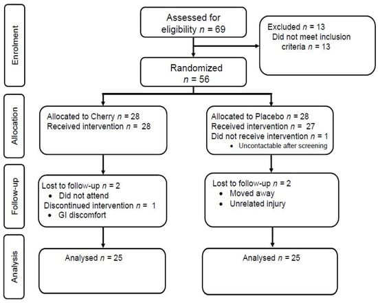 A total of 56 individuals were enrolled in the study and randomised to the intervention (Figure 1). There was no difference between the group characteristics at baseline (Table 1). Three participants from each group did not complete the study, as shown in Figure 1. One participant in the cherry group discontinued the juice and withdrew from the study due to gastrointestinal discomfort and bloating. The treatments were otherwise well-tolerated, as suggested by the SF-36, which showed no treatment, time, or interaction differences between the groups (data not shown). The mean (± SD) self-reported compliance (as assessed by tick sheets) was 94 ± 9% and 98 ± 4% in the cherry and placebo group, respectively. Five participants (20%) correctly guessed that they were in the placebo group; however, the Chi-square test suggested successful blinding (p = 0.386).