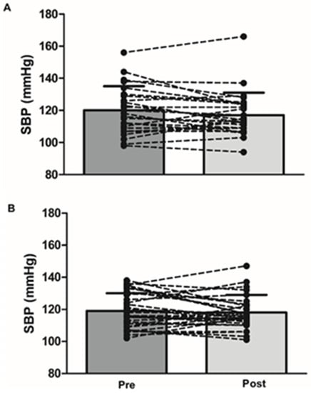 Systolic blood pressure before (left) and after 3-month supplementation (right) with cherry juice (A) and placebo (B).