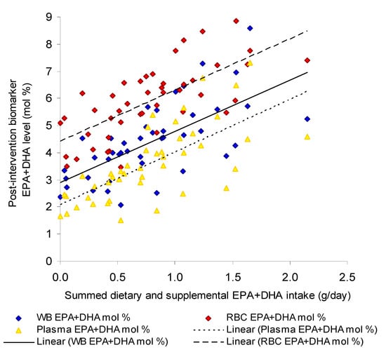 The increases in fingertip whole blood, erythrocyte and plasma n-3 LCPUFA levels (mol %) following DHA-rich tuna oil supplementation were all dose-dependent (Table 2). The dose explained 39–41% of the variability in post-intervention fingertip whole blood and erythrocyte DHA levels (mol %), but it explained only 16% and 4% of its respective concentrations (ug/mL blood) (Table 3). The dose explained 36% and 51% of the variability in post-intervention plasma EPA and DHA (mol %), respectively, but it explained only 23% and 33% of its respective EPA and DHA concentrations (ug/mL blood) (Table 3). In all biomarkers, the effect of dose was slightly stronger for DHA than EPA, except for erythrocyte when measured as µg/mL. Dose was a predictor of total n-3 LCPUFA levels (mol %) to a similar extent as DHA in all biomarkers, despite there being no dose-dependent changes in n-3 DPA.