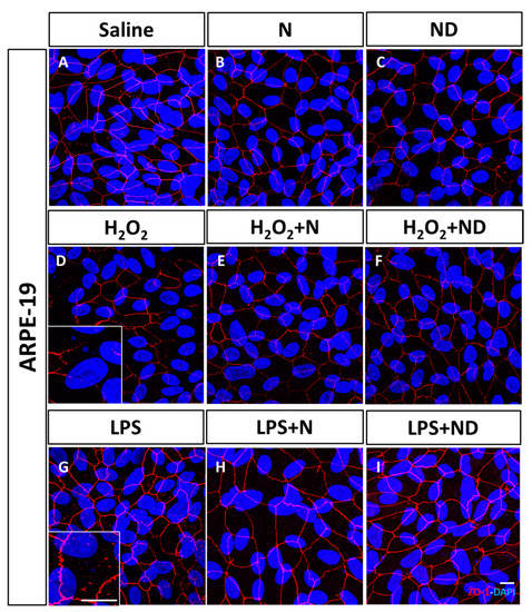 In order to assess the effect of oxidative stress and inflammation on tight junctions of ARPE-19 cells, we examined ZO-1 by immunofluorescence. There were disruptions and a reduction of immunofluorescence staining in the integrity of the apical areas of epithelial monolayer under oxidative stress induced by H2O2 (Figure 1D) compared to saline conditions (Figure 1A). Similarly, ZO-1 immunofluorescent staining under LPS-induced inflammation showed a disruption in cell contact (Figure 1G) in comparison to basal conditions (Figure 1A). Application of either N or ND treatments to the cell line showed formation of stable tight junctions (Figure 1B,C) similar to saline conditions (Figure 1A). Interestingly, when N and ND treatments were added in H2O2- (Figure 1E,F) and LPS-induced media (Figure 1H,I), they recovered the effect of oxidative stress and inflammation (Figure 1D,G) contributing to maintenance of cell polarity, suggesting a protective effect of N and ND on tight junctions and integrity in ARPE-19 cells.