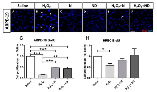 Late apoptosis assessed in ARPE-19 cells by TUNEL labelling and imaged under a confocal microscope. Application of N and ND treatments (62.34 μg/mL) to the media (C,D) showed similar results to saline (A). Addition of H2O2 (2 h; 600 μM) to induce oxidative stress increased TUNEL-positive-stained ARPE-19 cells (B; red), while TUNEL labelling was absent by application of N and ND treatments (62.34 μg/mL each) during the last hour of the induction (E,F). Nuclei were labelled with DAPI (blue). Scale bar: 50 µm. Cell proliferation assay was performed in both ARPE-19 and HREC cells (G,H), n = 3. BrdU expression levels were significantly reduced in both cell lines following oxidative stress-induced conditions by 1000 μM H2O2 for 2h. This effect was significantly recovered in ARPE-19 cells by application of N (p < 0.001) and ND (p < 0.01) treatments (62.34 μg/mL each) during the last hour of the induction, while a strong tendency towards significance was observed in HREC cells (* p < 0.05, ** p < 0.001, *** p < 0.001).