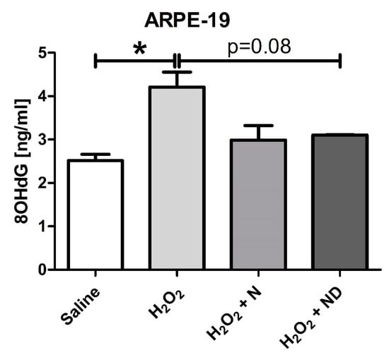 Figure 3 shows that oxidative stress induced by H2O2 significantly (p < 0.05) increased the expression levels of the marker representative for oxidative damage to DNA, 8-OHdG, in supernatants from ARPE-19 cells. Addition of either N or ND to the cells under induced oxidative stress resulted in a tendency to reduce 8-OHdG expression levels (p = 0.08 for ND).