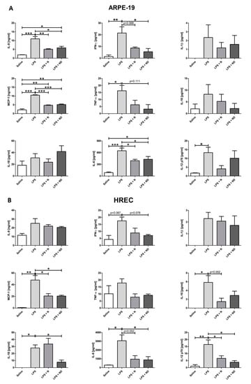 In our experiment, we noticed that the expression levels of few cytokines, in both ARPE-19 and HREC cells, under LPS-induced inflammatory conditions were not increased, and there was no significant difference with saline. A plausible reason could be the dispersion of controls in our study. In addition, absence of regulation of those proteins by LPS at the studied concentration could provide information on the expression pathway for each cell type.
