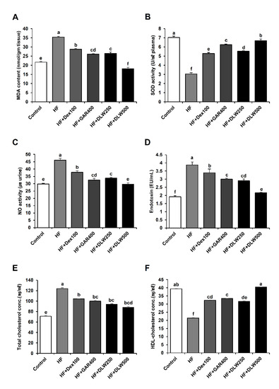 Effects of DLW on relative oxidative stress, cholesterol levels in tissue, serum, urine. MDA and NO activity levels were decreased. SOD activity levels were increased by HF+Dex100, HF+GAR400, HF+DLW250, and HF+DLW500. MDA, SOD, and NO were analyzed in extracts from the liver tissue, plasma, and urine following treatment with HF, HF+Dex100, HF+GAR400, HF+DLW250, and HF+DLW500. Plasma endotoxin concentration (EU/mL) as measured by the LAL assay following treatment with HF, HF+Dex100, HF+GAR400, HF+DLW250, and HF+DLW500. Total cholesterol and HDL cholesterol levels were affected by HF, HF+Dex100, HF+GAR400, HF+DLW250, and HF+DLW500. Total cholesterol and HDL cholesterol were analyzed in extracts from the serum following treatment with HF, HF+Dex100, HF+GAR400, HF+DLW250, and HF+DLW500. (A) MDA level. (B) SOD activity. (C) Nitric Oxide activity. (D) Endotoxin level. (E) Total cholesterol concentration. (F) HDL cholesterol concentration. The values presented are the means ± SD of three independent experiments. Means with different superscript letters are significantly different, p < 0.05. (one-way analysis of variance ANOVA followed by Tukey’s multiple test).