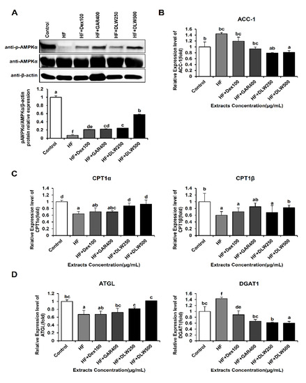 Effect of D. morbifera water (DLW) extract on gene expression levels related to lipid synthesis, lipid degradation, fatty acid oxidation, and transcription factors in the white adipose tissue (WAT) of HFD-induced obese mice. DLW influenced protein and mRNA expression of adipogenic genes in mouse WAT. (A) After 12 weeks of DLW treatment, the protein expression levels of p-AMPK by Western blot analysis were evaluated in WAT from mice fed standard diet, HFD, and HFD with DLW. Densitometric analyses for p-AMPK are presented as the relative ratio of each protein to total AMPKα, respectively. The mRNA expression levels of (B) ACC-1 and (C) CPT1α and CPT1β and (D) ATGL and DGAT1 by qRT-PCR were evaluated in WAT from mice fed standard diet, HFD, and HFD with DLW. Con, control group fed standard diet; HF, group fed high-fat diet; HF + Dex100, group fed high-fat diet in conjunction with Dextrin 100 mg/kg; HF + GAR400, group fed high-fat diet in conjunction with Garcinia 400 mg/kg; HF + DLW250, group fed high-fat diet in conjunction with D. morbifera water (DLW) extract 250 mg/kg; HF + DLW500, group fed high-fat diet in conjunction with D. morbifera water (DLW) extract 500 mg/kg; p-AMPK, phospho-AMP-activated protein kinase; AMPK, AMP-activated protein kinase; ACC, acetyl-CoA carboxylase; CPT1α, carnitine palmitoyltransferase-1 alpha; CPT1β, carnitine palmitoyltransferase-1 beta; ATGL, Adipose triglyceride lipase; DGAT1, Diacylglycerol acyltransferase 1. The values presented are the means ± SD of three independent experiments. Means with different superscript letters are significantly different, p < 0.05. (one-way analysis of variance ANOVA followed by Tukey’s multiple test).