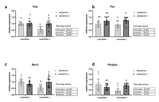Colonic mRNA level coding for host peptides in the colon. Gcg coding for glucagon-like peptides (GLP-1, GLP-2) (a), Pyy coding for peptide YY (b), Muc2 coding for mucin 2 (c) and Pla2g2a coding for phospholipase A2 group II (d). Ob/ob mice were fed a standard diet supplemented with or without berberine or curcumin for 4 weeks (n = 9 for each group). * p < 0.05 for berberine or curcumin effect (two-way ANOVA). Data with different superscript letters are significantly different at p < 0.05 (Tukey post-hoc test).