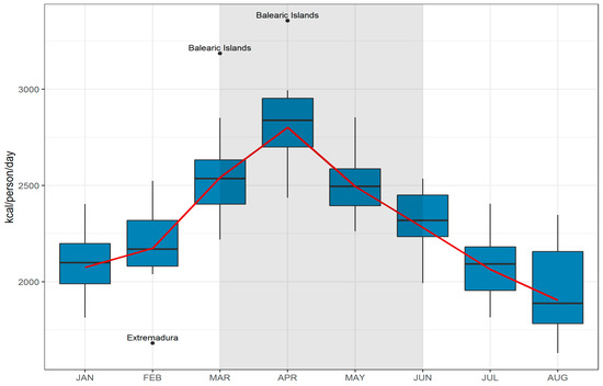 The variation in mean energy value of food purchased in Spanish households (kcal/person per day) across regions from January to August 2020 is shown in Figure 1. Consistently with the increase in food purchases observed during lockdown for all the food groups and in all regions, energy value was also increased. The highest average energy value was observed in April, with large differences between regions: the highest value corresponded to the Balearic Islands with 3355 kcal/person per day, and the lowest to La Rioja and Extremadura, with 2436 and 2441 kcal/person per day, respectively. Although April was, for most regions, the month with the largest increase in energy values, there were some regions with a greater increase in March (Balearic Islands and Canary Island (+42%)) or May (Extremadura (+45%)). Table S2 shows the energy estimated from food and beverages purchased in Spanish households, and the relative change with respect to 2019, by region.