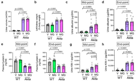 As expected, diabetes was associated with an increase in urine volume (Figure 2a) and renal hypertrophy as shown as an increase in the left kidney to the body weight ratio (Figure 2b), both of which were not affected by the MitoGamide treatment. Urinary albumin was significantly increased in Akita mice, indicating a renal functional abnormality at both mid-point (Figure 2c) and end-point (Figure 2d) of the study. Interestingly, Akita mice treated with MitoGamide had a further increase in urinary albumin excretion at mid-point. However, there was no change in urinary albumin between vehicle and MitoGamide-treated Akita mice at the end-point of the study. Plasma cystatin C, a marker of glomerular filtration rate, was reduced in Akita mice at both mid-point (Figure 2e) and endpoint (Figure 2f), indicating that Akita mice exhibited hyperfiltration and this was not affected by the MitoGamide treatment. Urinary excretion of the tubular damage-associated marker, KIM-1, was increased in Akita mice and was not changed by the MitoGamide treatment (Figure 2g,h). Collectively, these results suggest that the treatment with MitoGamide does not impact on diabetes-induced renal injury in Akita mice.