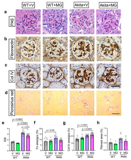 Glomerulosclerosis in the kidney was assessed histologically. As expected, Akita mice had an increase in GSI when compared to WT controls (Figure 3a,e). After 16 weeks of MitoGamide treatment, there was a small, but significant, reduction of GSI in the Akita mice (Figure 3e). Although a similar trend was observed in glomerular fibronectin immunostaining, the reduction by MitoGamide in Akita mice was not significant (Figure 3b,f). No change was observed in the increase of glomerular collagen IV immunostaining in MitoGamide-treated Akita mice when compared to vehicle-treated Akita mice (Figure 3c,g). Picrosirius red staining was used to assess the degree of tubulointerstitial fibrosis. There was no significant difference in tubulointerstitial fibrosis across all groups, which is not surprising as the Akita mouse model bred onto the C57BL/6J background is known to not exhibit marked changes in the tubulointerstitium [42].