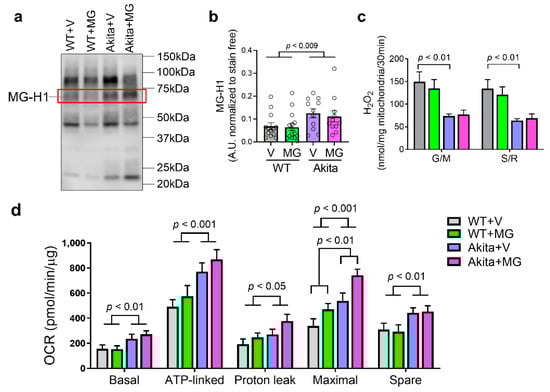 Methylglyoxal-derived hydroimidazolone-1 (MG-H1) is the most common product in serum and tissues when methylglyoxal reacts with an arginine residue of a protein [20,43]. There was an overall increase in methylglyoxal-derived MG-H1 in the renal cortex in Akita mice (p < 0.0084) (Figure 4a,b), but this was unchanged with the MitoGamide treatment. The levels of H2O2 produced by isolated mitochondria from the kidney cortex were found to be significantly reduced in Akita mice with no difference between the vehicle and MitoGamide-treated mice (Figure 4c).