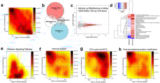 Characterization of transcriptome in kidney cortex of Akita mice following the MitoGamide treatment. (a) Rank-rank plot of gene expression differences due to diabetes and MitoGamide treatment. Genes were ranked by significance and the direction of the fold change. The top left corner shows that many genes which are downregulated in diabetes are restored by the MitoGamide treatment. The bottom right corner shows that genes which are upregulated by diabetes are attenuated by MitoGamide. (b) Venn diagram of MitoGamide attenuation of diabetes genes (FDR < 0.05). (c) MA plot of top differential genes in the Akita + vehicle and Akita + MitoGamide groups. (d) Gene set enrichment analysis of diabetes (Akita + vehicle) and MitoGamide (Akita + MitoGamide) groups, showing the top 25 Reactome pathways. Rank-rank density plots of differential genes in the (e) olfactory signaling pathway, (f) the immune system (g), the citric acid cycle (TCA) and respiratory electron transport (h), and post-translational protein modification pathways. The x-axis corresponds to the effect of diabetes (Akita mice) and the y-axis corresponds to the effect of MitoGamide.