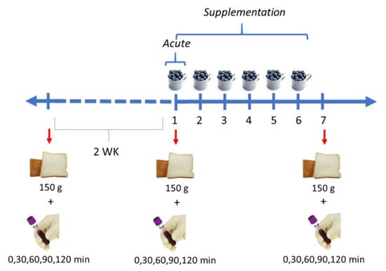 Individuals acted as their own controls participating in an acute and a supplementation intervention. Subjects were scheduled at a minimum of two weeks between treatments to ensure an adequate washout period for the next intervention. For the baseline (control), subjects consumed 150 g of white bread. For the acute study, they consumed 150 g of white bread with 150 g of unprocessed frozen blueberries (immediately). For the short-term supplementation, subjects ate 150 g of unprocessed blueberries daily for 6 days, then they consumed 150 g of white bread at day 7 for blood collection (Figure 1).