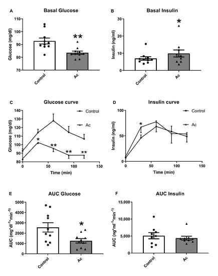 Glucose and insulin results after acute fresh blueberry consumption (Ac). (A) Basal fasting glucose levels. (B) Basal fasting insulin levels. (C) Glucose curve after 150 g of white bread consumption. (D) Insulin curve after 150 g white bread consumption. (E) Area under the curve (AUC) of plasma glucose after 150 g of white bread consumption. (F) Area under the curve (AUC) of plasma insulin after 150 g of white bread consumption. * p < 0.05 vs control or t = 0, ** p < 0.01 vs control or t = 0.