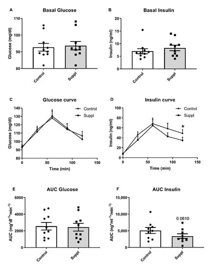 Glucose and insulin results after short-term fresh blueberry supplementation (Suppl). (A) Basal fasting glucose levels. (B) Basal fasting insulin levels. (C) Glucose curve after 150 g of white bread consumption. (D) Insulin curve after 150 g white bread consumption. (E) Area under the curve (AUC) of plasma glucose after 150 g of white bread consumption. (F) Area under the curve (AUC) of plasma insulin after 150 g of white bread consumption. * p < 0.05 vs. control.