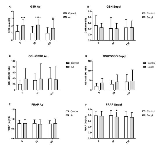 Plasma glutathione levels and antioxidant capacity measured by FRAP assay after acute consumption (Ac) and short-term blueberry supplementation (Suppl) compared to baseline levels (control). (A) GSH in acute consumption. (B) GSH in short-term supplementation. (C) GSH/GSSG in acute consumption. (D) GSH/GSSG in short-term supplementation. (E) FRAP in acute consumption. (F) FRAP in short-term supplementation. Baseline levels are shown by white bars while grey bars represent treatments. * p > 0.05 vs control, ** p < 0.01 vs control, *** p < 0.001 vs. control and **** p < 0.0001 vs. control. GSH: expressed as mM; GSSG: expressed as mM; FRAP: expressed as mg/dl.