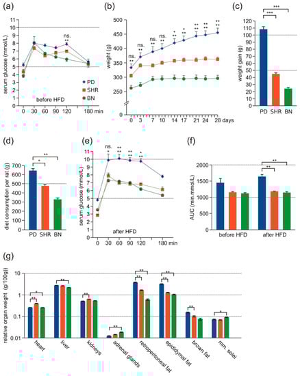 It is known that PD rats develop marked hypertriglyceridemia after being fed a high-sucrose diet []; however, the effects of a high-fat diet on the development of MetS have not been thoroughly tested yet. For the experiment and subsequent comparison, two other control rat strains were chosen, SHR and BN. SHR is also considered as a model of MetS: after high-sucrose diet feeding, rats of SHR develop MetS traits (including visceral obesity, lipid and glucose metabolism impairment), characterized by constitutive arterial hypertension []. The BN strain, on the other hand, does not develop MetS [,,].
