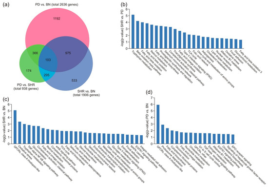 Differentially expressed genes in the liver after HFD. Venn diagram (a), pathway enrichment analysis using Transcriptomic analysis console software (b–d). (b) Pathway enrichment analysis-SHR vs. PD comparison. (c) Pathway enrichment analysis—SHR vs. BN comparison. (d) Pathway enrichment analysis − PD vs. BN comparison.