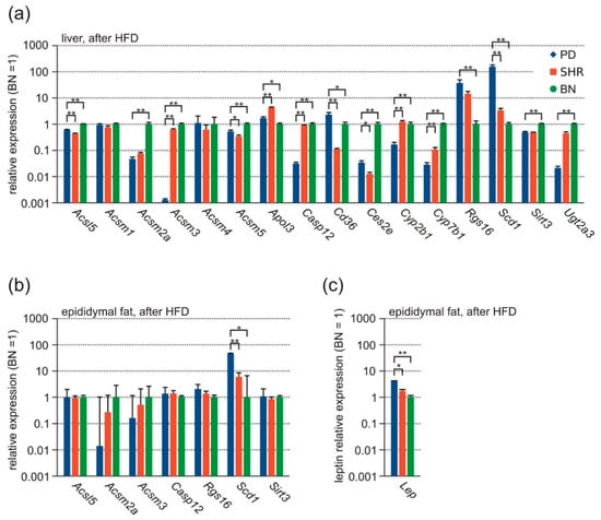 Gene expression (qPCR) after HFD in adult male rats-PD (blue, n = 7), SHR (red, n = 6), and BN (green, n = 8). (a) Liver tissue. (b) Epididymal fat tissue. (c) Leptin expression in epididymal fat. Data are presented as arithmetic means ± SEM. Statistical significance levels for the factor strain of one-way ANOVA are indicated for pair-wise post hoc Tukey’s test as follows: * p < 0.05, ** p < 0.01.