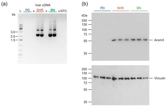 Expression of Acsm3 in the liver of adult male rats-PD (blue), SHR (red), and BN (green); after HFD. (a) RT-PCR of Acsm3, visualized on gel electrophoresis (two representative samples for each strain). Primers flank the complete coding sequence; the expected size of the PCR product is 2296 bp. (b) Western blotting of ACSM3 (expected molecular weight of the mature polypeptide 63.2 kDa). Vinculin (expected molecular weight 116.6 kDa) was used as the loading control (three representative samples for each strain).