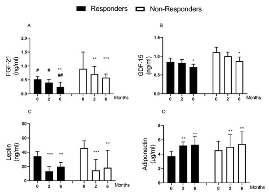 Change in plasma biomarkers after weight loss and remission of type 2 diabetes. Data are presented as median (IQR) except for GDF-15 (mean ± SEM). (A): FGF-21, (B): GDF-15, (C): Leptin, (D): Adiponectin. There were 29 participants (12 responders/17 non-responders) studied at baseline, 2, and 6 months post-weight loss. FGF-21 Data for one responder is missing (n = 11). * p < 0.05 vs. 0 month, ** p < 0.01 vs. 0 month, *** p < 0.001 vs. 0 month. # p < 0.05 vs. non-responders, ## p < 0.05 vs. non-responders.