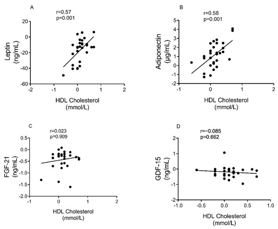 There was a positive correlation between the rise in HDL cholesterol and the decrease in leptin (r = 0.57, p = 0.001), and rise in adiponectin (r = 0.58, p = 0.001) levels, Figure 4A,B). However, there was no such relationships between HDL cholesterol and FGF-21(r = 0.02, p = 0.91) or GDF-15 (r = −0.09, p = 0.66), Figure 4C,D.