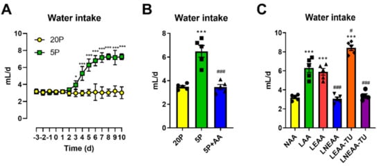 To begin with, we examined the effects of a dilution of dietary protein (DPD) on water intake over time (Figure 1A). Importantly, the ~3 mL/d water intake on the control diet was within the typical range of laboratory mice [32]. Of note, DPD caused a significant increase after 3 days (~25%) with a sustained increase (~100%) in water intake (i.e., hyperdipsia) after 6–7 days (Figure 1A). As several of the effects of DPD were due to amino acid restriction [32], we then examined whether this could also be true for altered water intake. Indeed, when we topped up a protein diluted diet with amino acids (5P + AA) to match that of the control diet (20P), the higher water intake with DPD was completely blunted (Figure 1B). However, since the total carbohydrate content of these diets was simultaneously altered to keep them isocaloric, this study could not discern whether the difference was specifically due to altered protein/AA or carbohydrate. To address this, as well as which particular class of AA (essential or non-essential [2]) were required for the effects of DPD on hyperdipsia, we then performed an experiment where EAA and NEAA were specifically manipulated (Figure 1C). Whether an AA was EAA or NEAA was defined on the basis of nutrition studies showing a failure to thrive when a single AA was absent in the diet fed to adult rodents under standard laboratory conditions [1,2]. Additionally, we used diets which were topped up with the alternate source of AA to keep the total AA supply constant without altering dietary fat or carbohydrate supply (Figure 1C). As shown in Figure 1C, a selective restriction of EAA fully reproduced the effects of DPD on heightened water intake, with an even higher effect when EAA restriction was combined with NEAA top-up to keep the nitrogenous calories equal to the control diet group (NAA).
