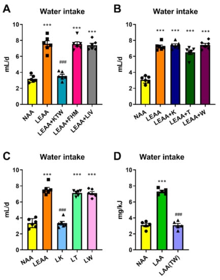 Restriction of Threonine and Tryptophan is sufficient and necessary for the effect of dietary protein dilution on hyperdipsia. (A): Water intake rate of mice fed a normal amino acid diet (NAA, 18% calories from AA), a low essential amino acid diet (LEAA) with EAA at values of a 4.5% total AA diet, and a LEAA diet supplemented with either lysine, threonine, and tryptophan (LEAA + KTW), phenylalanine, histidine, and methionine (LEAA + FHM), or leucine, isoleucine, and valine (LEAA + LIV). All diets were adjusted to 18% AA in total by non-essential AA (NEAA) top-up. Data are mean ± SEM (n = 6 per group). Different than diet NAA: *** p < 0.001. Different than diet LEAA: ### p < 0.001. (B): Water intake of mice treated with NAA, LEAA, and LEAA supplemented with either lysine (LEAA + K), threonine (LEAA + T), and tryptophan (LEAA + W), all with NEAA equally adjusted to give 18%AA in total. Data are mean ± SEM; n = 6 mice per group. Different than diet NAA: *** p < 0.001. (C): Water intake of mice in response to treatment with the following diets NAA, LEAA, and diets with restricted amounts of either lysine (low lysine, LK), threonine (LT), and tryptophan (LW). All diets were equally adjusted with the other AA to give 18%AA in total. Data are mean ± SEM; n = 6 per group. Different than diet NAA: *** p < 0.001. Different than diet LEAA: ### p < 0.001. D: Water intake of mice in response to treatment with the following diets: NAA (normal amino acid, 18% energy from AA), LAA (low AA, 4.5% AA as used in Figure 1C), and LAA supplemented with threonine and tryptophan while keeping total AA at 4.5% (LAA(TW). Data are mean ± SEM (n = 5 per group). Different than NAA: *** p < 0.001. Different than LAA: ### p < 0.001. Statistical analyses: One-way ANOVA (A–D).