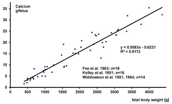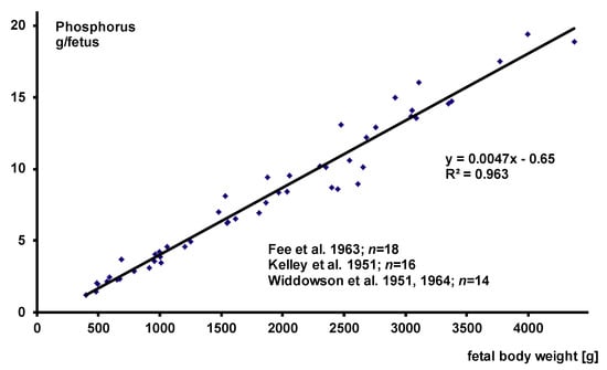 Three major papers on body composition assessment of human fetuses at various stages of gestation have been published so far [43,44,45]. Figure 1 and Figure 2 give the calcium and phosphorus data of all analyzed fetuses in which total body analyses of P and Ca together have been performed. There is a strong linear association between fetal body weight and total calcium or total phosphorus measurement. Therefore, with regard to the Ca to P ratio, fetal body composition is constant throughout the analyzed weight range and absolute values depend on weight gain.