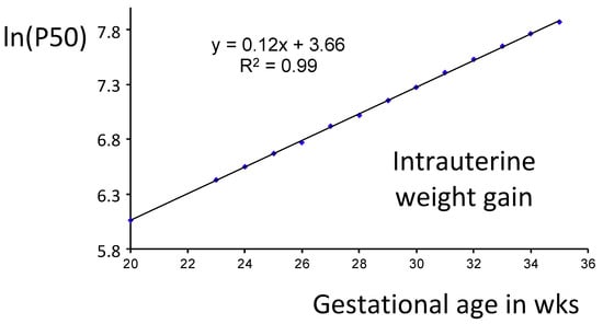 Weight gain is obviously the major determinant of mineral requirements. The German newborn infant’s growth reference was based on the cross-sectional measurement of weight at birth of more than 1.8 million term and preterm infants, and is therefore regarded as one of the largest growth references available [48]. Figure 3 shows that there is a highly significant linear association between gestational age in weeks and the natural logarithms of the 50th weight percentile of this growth reference. These data suggest that the average fetal (intrauterine) weight gain of infants up to 34 weeks of gestation may mathematically be approximated by exponential weight gain of 17 g/kg/day.