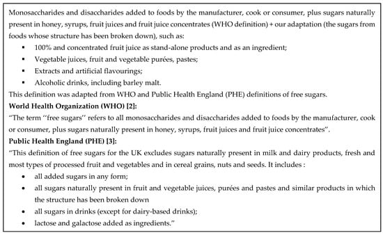 3. E Swan, G.; A Powell, N.; Knowles, B.L.; Bush, M.T.; Levy, L.B. A definition of free sugars for the UK. Public Health Nutr. 2018, 21, 1636–1638. [Google Scholar] [CrossRef] [PubMed]