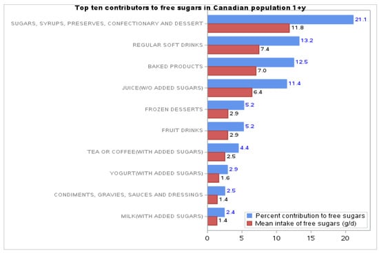 15. Brisbois, T.D.; Marsden, S.L.; Anderson, G.H.; Sievenpiper, J.L. Estimated Intakes and Sources of Total and Added Sugars in the Canadian Diet. Nutrients 2014, 6, 1899–1912. [Google Scholar] [CrossRef] [PubMed]