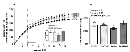 A Dose×Form interaction effect was also found on measures of cumulative food intake up to 19 weeks post-weaning (Dose p = 0.7, Form p = 0.05, Dose×Form p = 0.02, Figure 1B). The 5X-MTHF female offspring consumed ~8% more food compared to the 5X-FA offspring, but food intakes of the 1X folate offspring were similar to both 5X groups. Cumulative food intake and total weight gain of the offspring were also strongly and positively correlated within each group (1X-FA r = 0.89, p < 0.001, 1X-MTHF r = 0.90, p < 0.001, 5X-FA r = 0.71, p < 0.01; 5X-MTHF r = 0.72, p < 0.01).