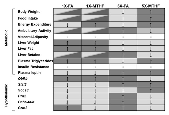 Summary of main metabolic and hypothalamic changes observed in offspring born to dams fed the gestational diets. Diet group panels that do not share the same colour reflect significant differences observed in the outcome measure. Panels that contain two colours have comparable outcome measures to both dark and light grey panels. Arrows indicate direction of change (↑increased, ↓decreased). Hyphen (-) indicates no difference between all groups Abbreviations: AIN-93G rodent diet with either 1X-FA, recommended folic acid (2 mg/kg diet); 5X-FA (10 mg/kg diet); 1X-MTHF, equimolar recommended [6S]-5-methyltetrahydrofolic acid calcium salt (2.1 mg/kg diet); or 5X-MTHF (10.4 mg/kg diet). ObRb, leptin receptor long isoform; Stat3, signal transducer and activator of transcription 3; Socs3, suppressor of cytokine signaling-3; Drd2, dopamine receptor type 2; Gabr-4a/d, gamma-aminobutyric acid type A receptors subunit 4alpha and delta; Grm2, glutamate receptor type-2.