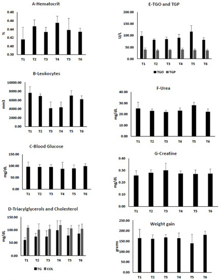 Biochemical results after Amazonian pulp fruits consumption in Wistar rats (n = 10 rats/group), T1—Control; T2—Araçá-Boi; T3—Abiu-grande; T4—Araticum; T5—Biri-biri; T6—Yellow mangosteen; TGO—glutamic-oxaloacetic transaminase; TGP—glutamic-pyruvic transaminase; TG—triacylglycerol and Col—Cholesterol. Mean values and standard deviation are presented.