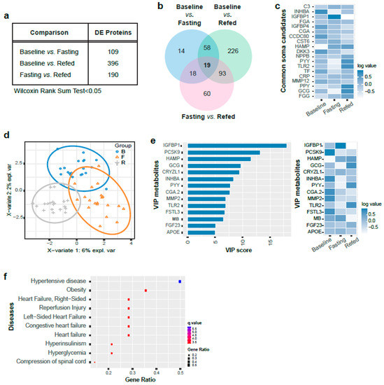 Differentially expressed proteins identified in the indicated comparisons. (a) Table showing the number of DE (differentially expressed) proteins identified in the indicated comparisons (Wilcoxin rank sum test <0.05, n = 20). (b) Venn diagram of DE proteins from three comparisons (Wilcoxin rank sum test <0.05, n = 20). (c) Heatmap of 19 overlapped proteins identified by SomaLogic analysis in three comparisons (log transformed value of the mean relative fluorescent intensity). (d) PLS-DA (artial least square-discriminant analysis) plots from three comparisons (n = 20, blue, Baseline; orange, Fasting; gray, Refed). (e) Bar graphs of 14 VIP (variables of importance in prediction) proteins from three comparisons (VIP score >5, left panel). VIP scores rank the serum proteins as the most important for differentiating overall serum protein profiles between the groups indicated in the key. All VIP proteins indicated also differed in post hoc analyses (p < 0.05). Heatmap of 14 VIP proteins in three comparisons (log value of the relative fluorescent intensity, right panel). (f) Disease association analysis with VIP proteins (p < 0.05).