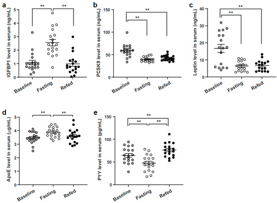 To determine if the levels of the identified VIP score proteins were differentially expressed in the serum from the different nutrient conditions, serum was assayed by ELISA’s targeting six of these proteins. The highest ranked VIP proteins were insulin-like growth factor-binding protein 1 (IGFBP1) and proprotein convertase subtilisin/kexin 9 (PCSK9). Interestingly, the ELISA assays showed the IGFBP1 levels were significantly elevated in the 24-h fasting serum, and the PCSK9 distinguished the baseline compared to the fasting and refeeding states (Figure 3a,b). Interestingly, the leptin levels paralleled PCSK9 with the distinct group being at baseline (Figure 3c). Apolipoprotein E (ApoE) mirrored IGFBP1, with the highest levels in the fasted state, and PYY was most highly expressed in the refed state (Figure 3d,e). The relative fluorescence intensity graph and heatmap measured from the three nutrient conditions is shown in Supplementary Figure S3A–E.