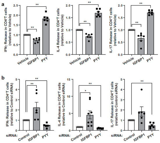 Characterization of immunomodulatory effects of IGFBP1 and PYY. (a) Cytokine release after treatment of recombinant proteins (100 ng/mL IGFBP1 or 20 nM PYY3-36) for the last 24 h of incubation in CD4+ T cells followed TCR activation for 3 days (n = 6). (b) Cytokine release following KD in CD4+ T cells by TCR activation for 3 days (n = 6–8). Unpaired student T test; * p value < 0.05; ** p < 0.01. IGFBP1, Insulin-like growth factor-binding protein 1; PYY, Peptide tyrosine-tyrosine; TCR, T cell receptor.