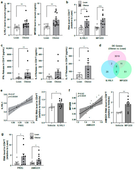 Given the significant enrichment of the VIP serum proteins in obesity, we further evaluated whether any of these serum protein candidates are operational in other nutritional load conditions. We assayed their levels in serum from overnight fasted lean and obese subjects. While the levels of IGFBP1 and PYY were not different between these two groups (data not shown), both IL1RL1 and MFGE8 were significantly elevated in serum and at the transcript levels in CD4+ T cells, respectively, in the obese compared to lean serum group (Figure 6a,b). Body mass index from lean and obese subjects is described in Materials and Methods. Although obesity is linked to inflammation through multiple mechanisms [47], in this study exploring CD4+ T helper cell responsiveness, the extent of TCR-mediated cytokine production was restricted to Th1 and Th17 cells, as evident by the significantly higher levels of IFNγ and IL-17 in the obese versus lean subject cells (Figure 6c).