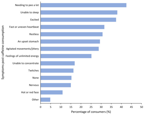 Caffeine is well known for its positive effects, such as increasing alertness and combating fatigue [22,23,24]. Similarly, Cohen et al. [25] reported that tertiary students perceived that they were significantly more alert, awake, clear-minded and able to concentrate after ingesting low doses of caffeine; such effects are desirable for academic work. Alternatively, excessive caffeine consumption can cause negative symptoms ranging from anxiety, nausea, palpitations, upset stomach, headaches and sleeplessness through to respiratory problems, liver and heart damage, seizures and death [26].