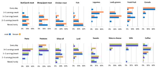 The Figure 2 shows the consumption frequency of foods separately in males and females. A strong consumption of cereals (mainly homemade bread) and, less frequently, vegetables (pulses, leafy greens) and fresh fruit was detected in both sexes. The consumption of potatoes was quite high (21% of males and 43% of females reported a daily consumption). Meat was consumed moderately, i.e., by 20–60% of female and 30–60% of male responders, and depending on the type of meat they claimed never or rarely ate it. As for beef or pork, it was consumed 2–3 servings a month by 38% of females and 1–2 servings a week by 36% of males. Sheep or goat meat was consumed at most 1–2 times a week by 27% of females and 30% of males. The consumption of poultry meat was greater: 40% of females and more than half of males consumed it at least 1–2 times a week (see Supplementary Materials). Noticeably, most LBZ families used to raise free-range chicken in the courtyard (without antibiotics and/or artificial feed). The consumption of lard was slightly lower to that of olive oil. Although BZ villages are not far from the sea, fish was not the preferred food in this community (more than half of responders never or rarely ate seafood) (Figure 2)